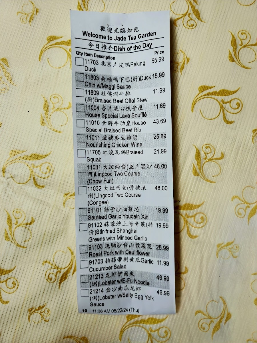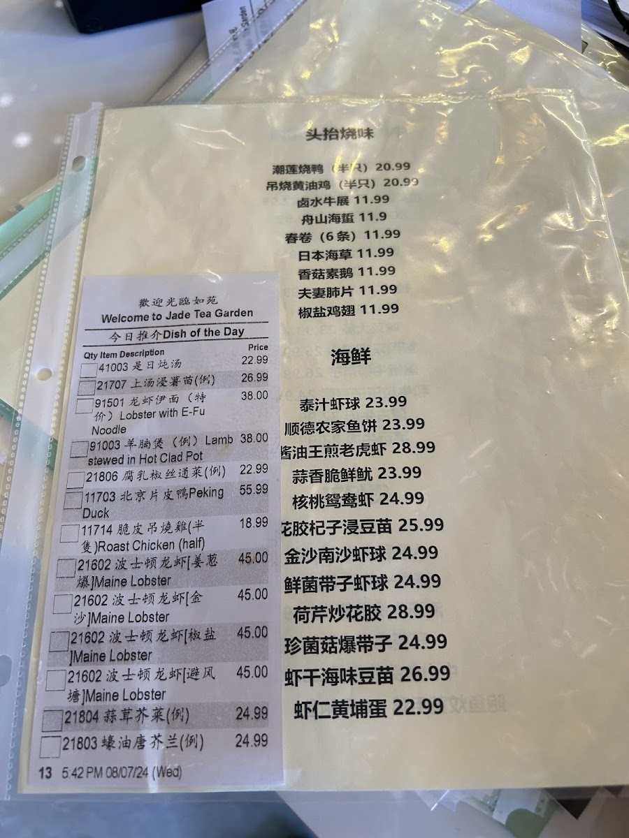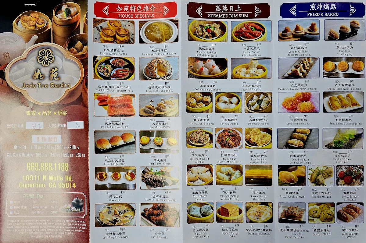 Jade Tea Garden offers an impressive menu that blends bold flavors and unique ingredients, offering diners a truly distinctive experience. Their Chef’s Special BBQ section features a variety of savory options, including Crispy Roast Squab, Macau Roast Meat, and Empress Chicken Soy Sauce Chicken Platter, along with regional favorites like Beijing-style Skin-sliced Duck and Guangzhou-style Roasted Ducks. These options are perfect for those who enjoy traditional roasted meats with a modern twist.